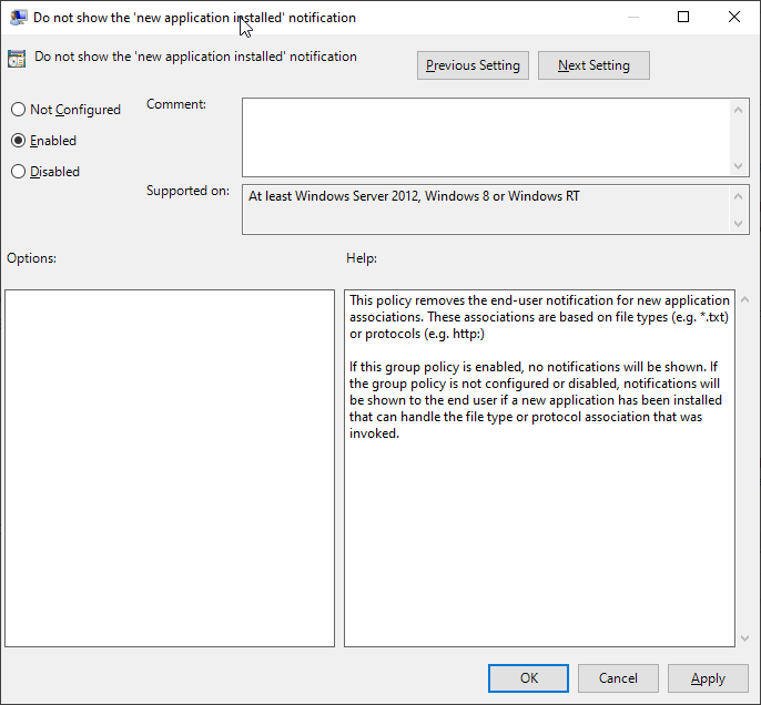 To prevent the message How do you want to open this file from appearing, you have to _Enable _the Group Policy setting Do not show the ‘new application installed’ notification. This Group Policy can be found under Computer Configuration > Policies > Administrative Templates > Windows Components > File Explorer.