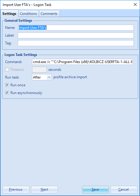 Edit the Import User FTA’s – Logon Task and check the Run once checkbox.