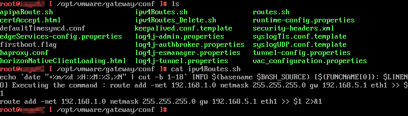 Now that the static route has been configured, an ipv4Routes.sh script has been created in the folder /opt/vmware/gateway/conf. This script is triggered by the routes.sh script in the same folder. This makes sure the static route will always be configured during each reboot.