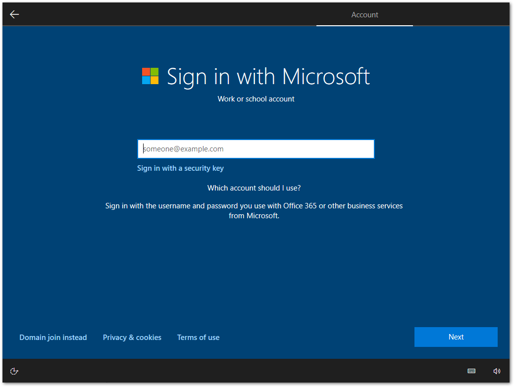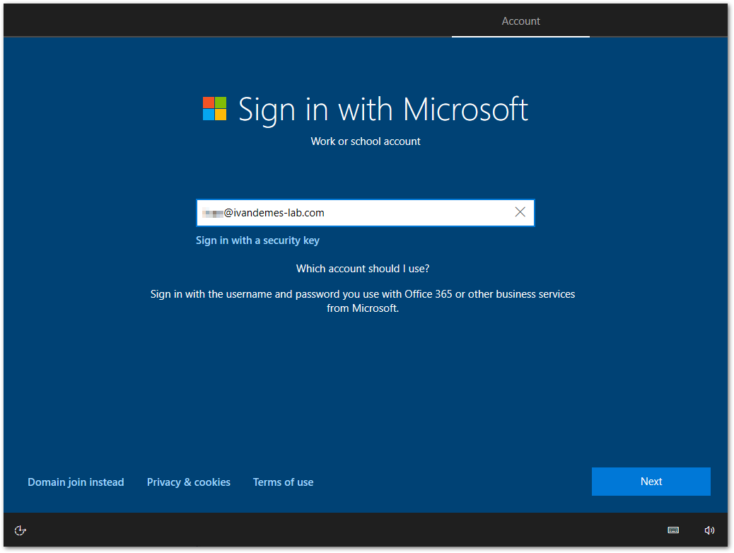 So, with all the previous stuff configured, I believed I was ready to enroll a Windows 10 device. I started spinning up my “new device” (VM) and started signing in using my e-mail address.