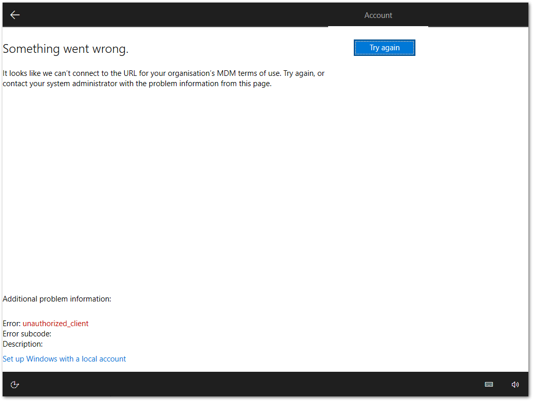 After clicking Exit, I got another message “Something went wrong. It looks like we can’t connect to the URL for your organisation’s MDM terms of use.“.