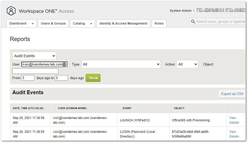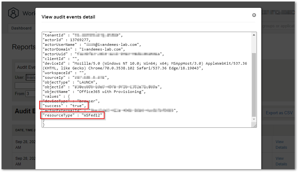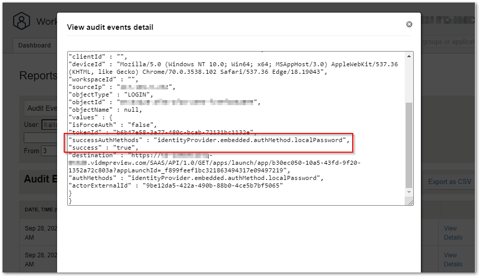 I started looking at the Workspace ONE Access audit events for my specific sign in.