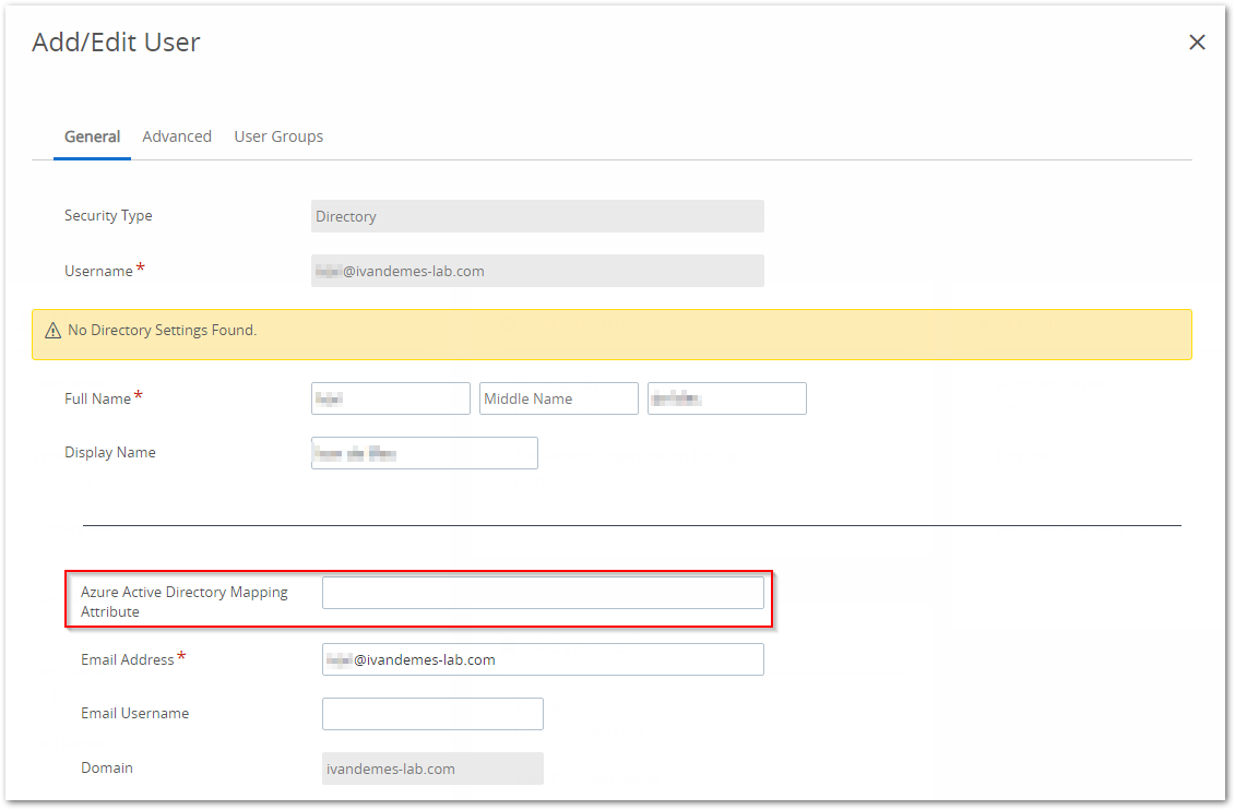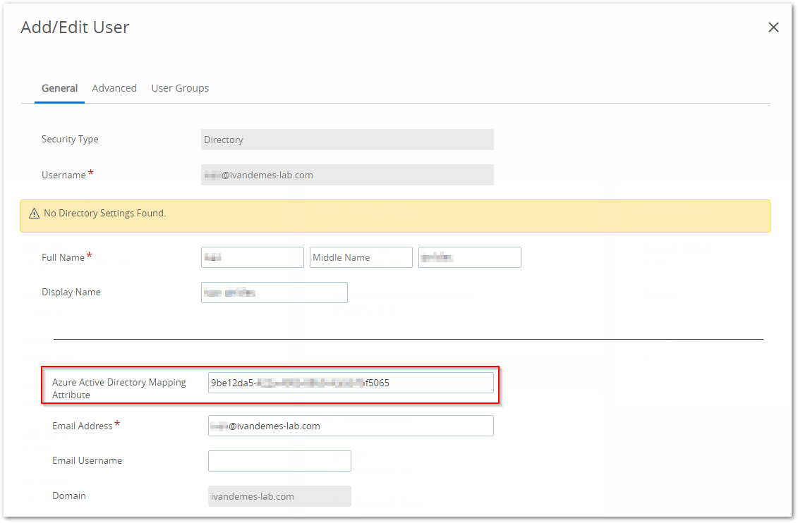 I started investigating my user account in Workspace ONE UEM and compared the account properties with the lab configuration of my colleague Jesper Alberts. This is where we found out that his accounts, synced from an on-prem Active Directory and synced with Azure AD, contained a GUID value for the Azure Active Directory Mapping Attribute. This was empty for my user account in Workspace ONE UEM.