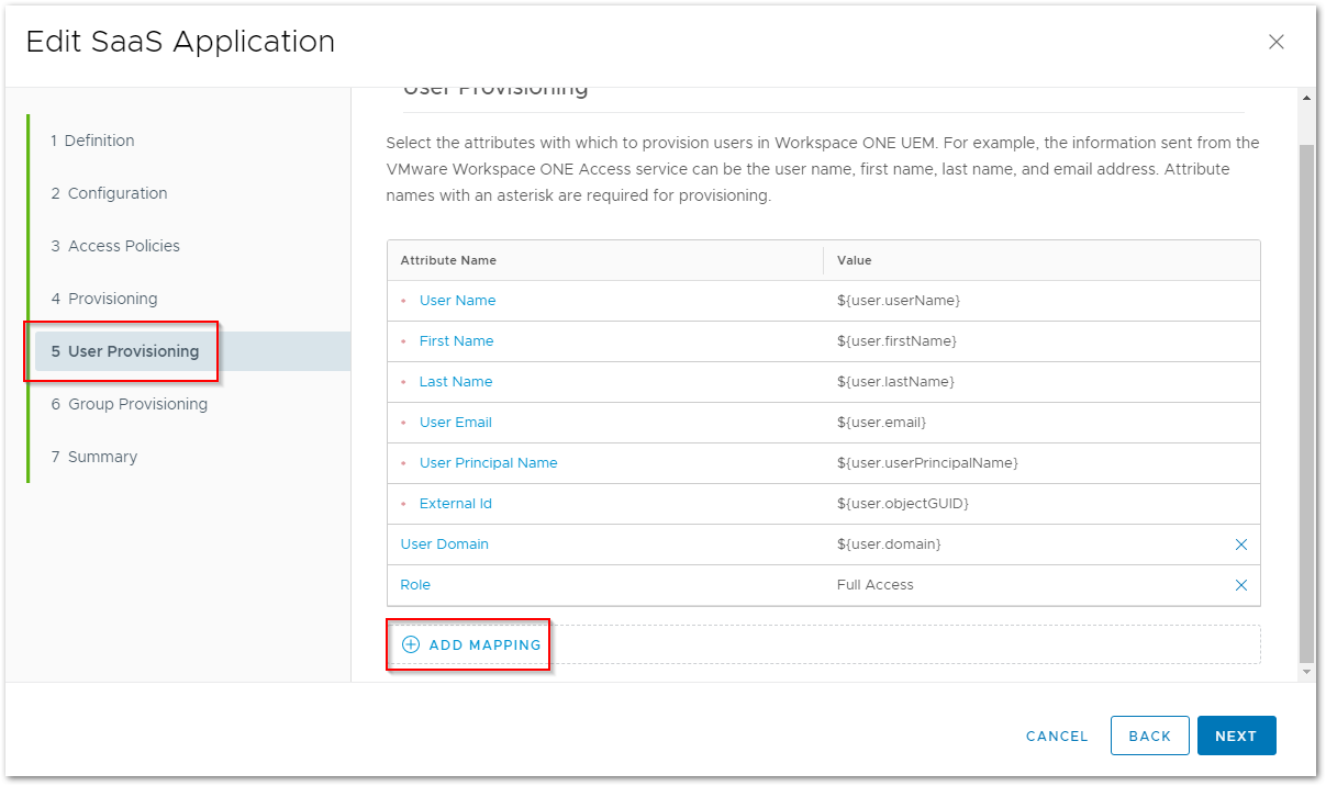 I was glad to find out what the issue was, but I wanted to automatically have the Azure Active Directory Mapping Attribute for my user accounts in Workspace ONE UEM configured with the correct GUID value. Therefore, I opened up the AirWatch Provisioning app configuration in Workspace ONE Access and headed to the User Provisioning section. Since I wanted to create a new mapping, I clicked ADD MAPPING.